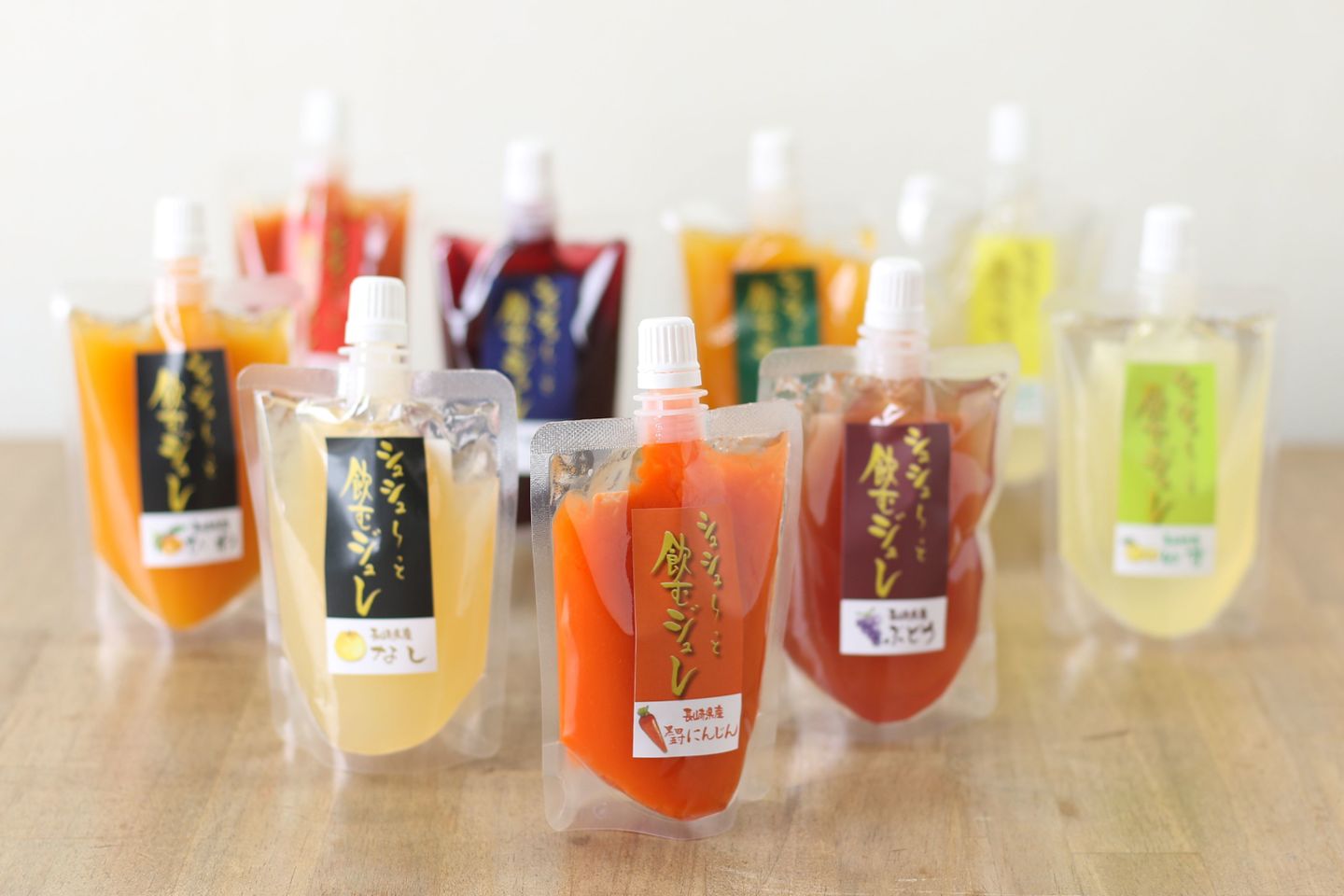 手軽に持って飲めるゼリー『シュシュ〜っと飲むジュレ』は飲み口が小さくて飲みやすく、野菜や果物の美味しさを活かし着色料、香料、保存料などは使用していませんので、赤ちゃんの離乳食やお年寄りの方への補食としてもお勧めです。ご贈答のほか、お見舞などにも喜ばれています。