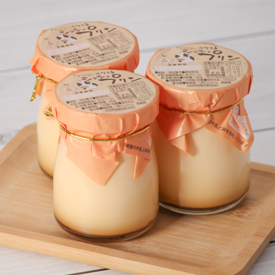 プリン生地は長崎県産の厳選された牛乳・卵を使用ており、保存料を一切使用せず、じっくり蒸し焼きにした独特のなめらかな食感に仕上げております。