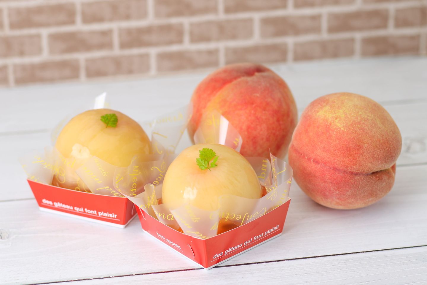 毎年桃が旬の時期にしか販売していない洋菓子工房大人気商品の「ももたろう」は1つ1つ丁寧に種を抜いて皮を剥いた丸ごと桃を使用しております。種があった部分には洋菓子工房特性のカスタードがきっしり!まんまるツヤツヤのフォルムから溢れ出るみずみずしい果汁をぜひご堪能くださいませ。